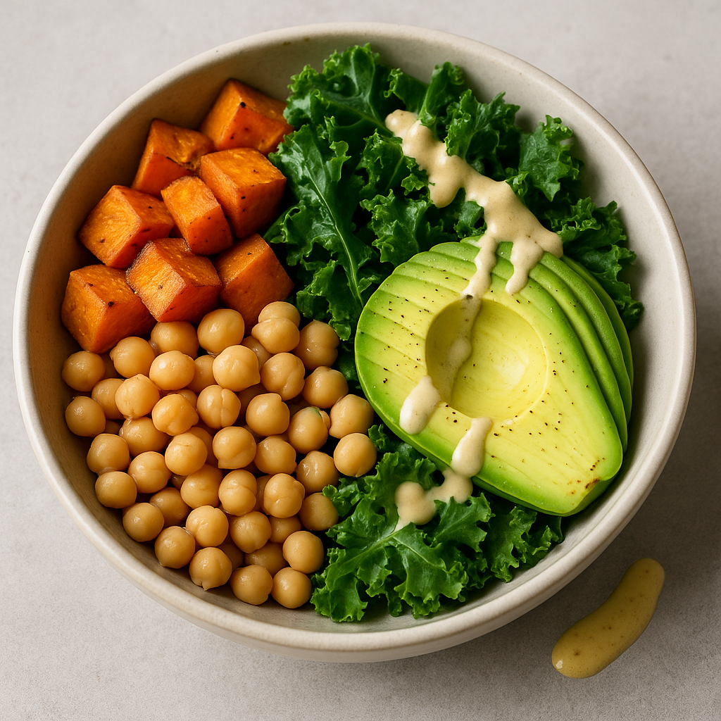 Arrange kale, sweet potatoes, chickpeas, and avocado in a bowl.