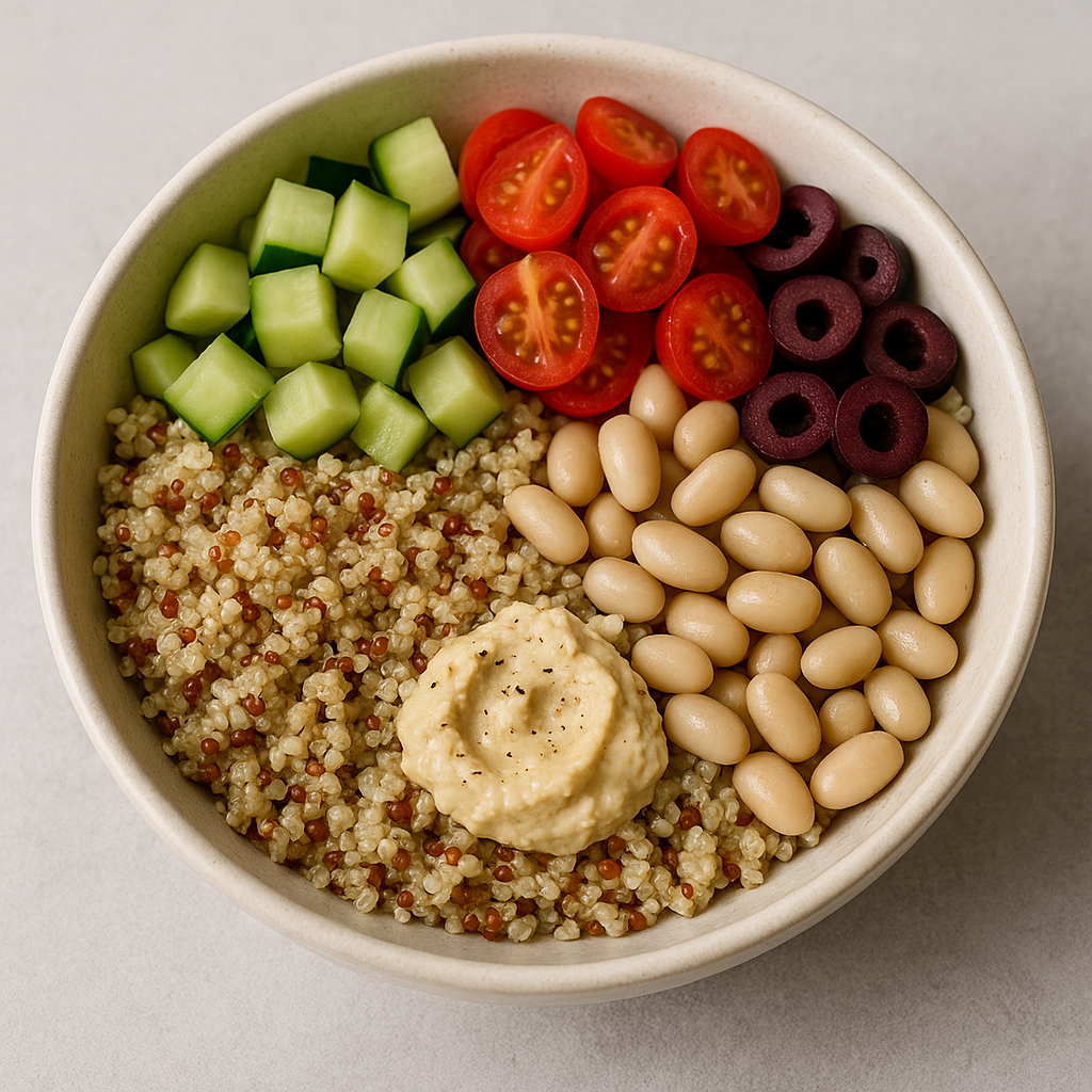 Mix quinoa, cucumber, tomatoes, olives, and beans.